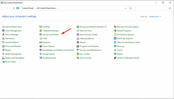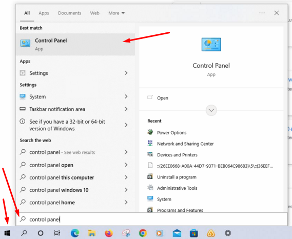 2. Click the start button, type ‘Control Panel” Click control panel app