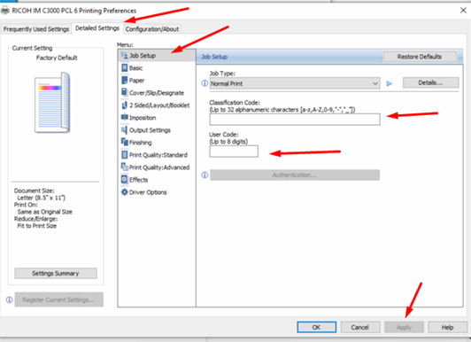 5. Click Detailed settings, click Job Setup, Enter your printer code in the classification and user code boxes, click apply and then ok.